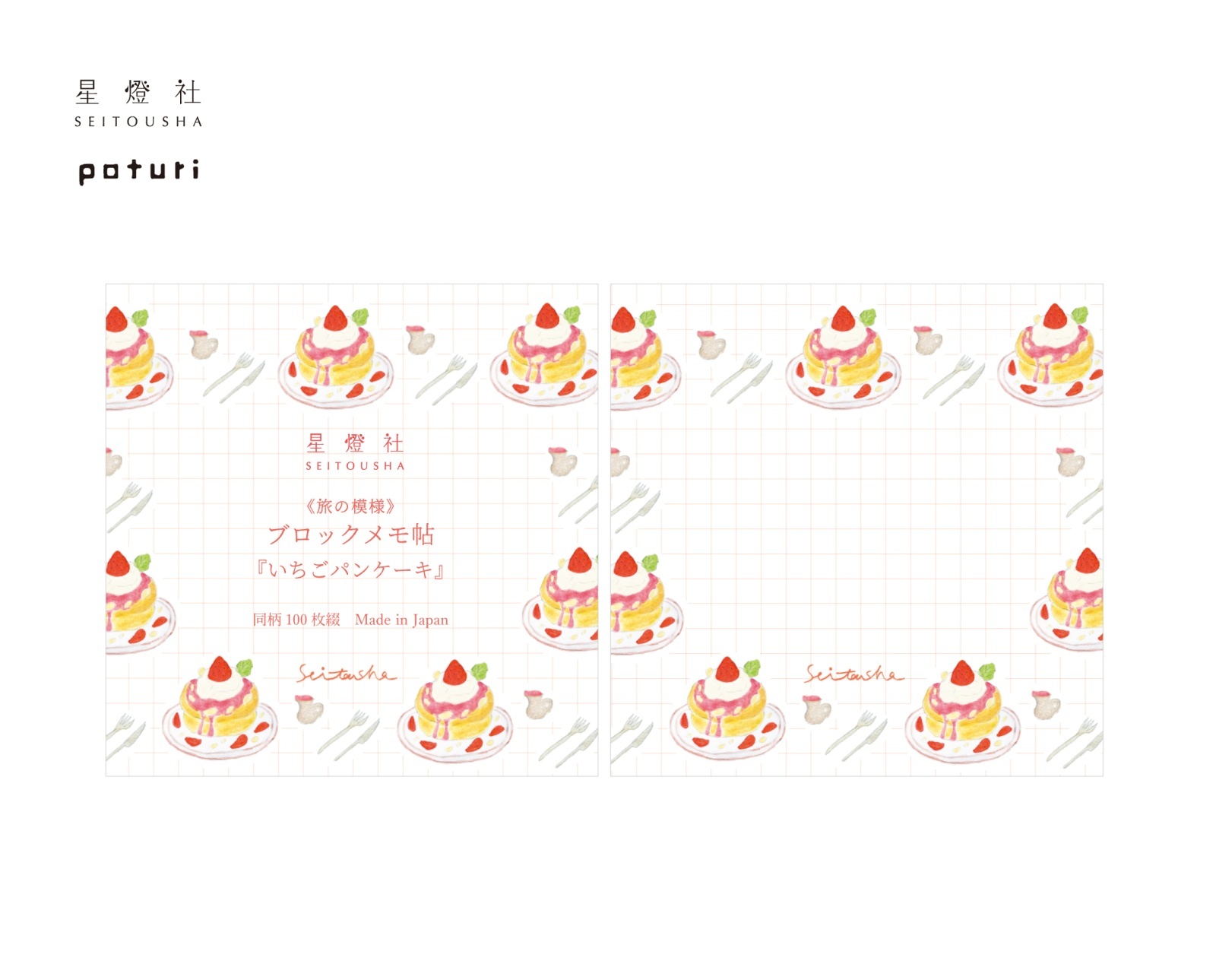 2025年10月新作〔400円×5個〕ブロックメモ帖 旅の模様『いちごパンケーキ』/同柄100枚綴り